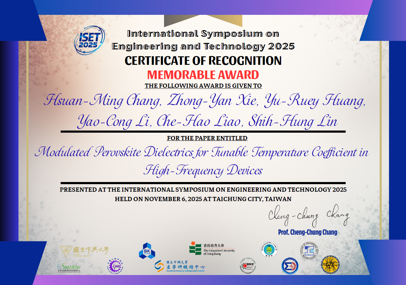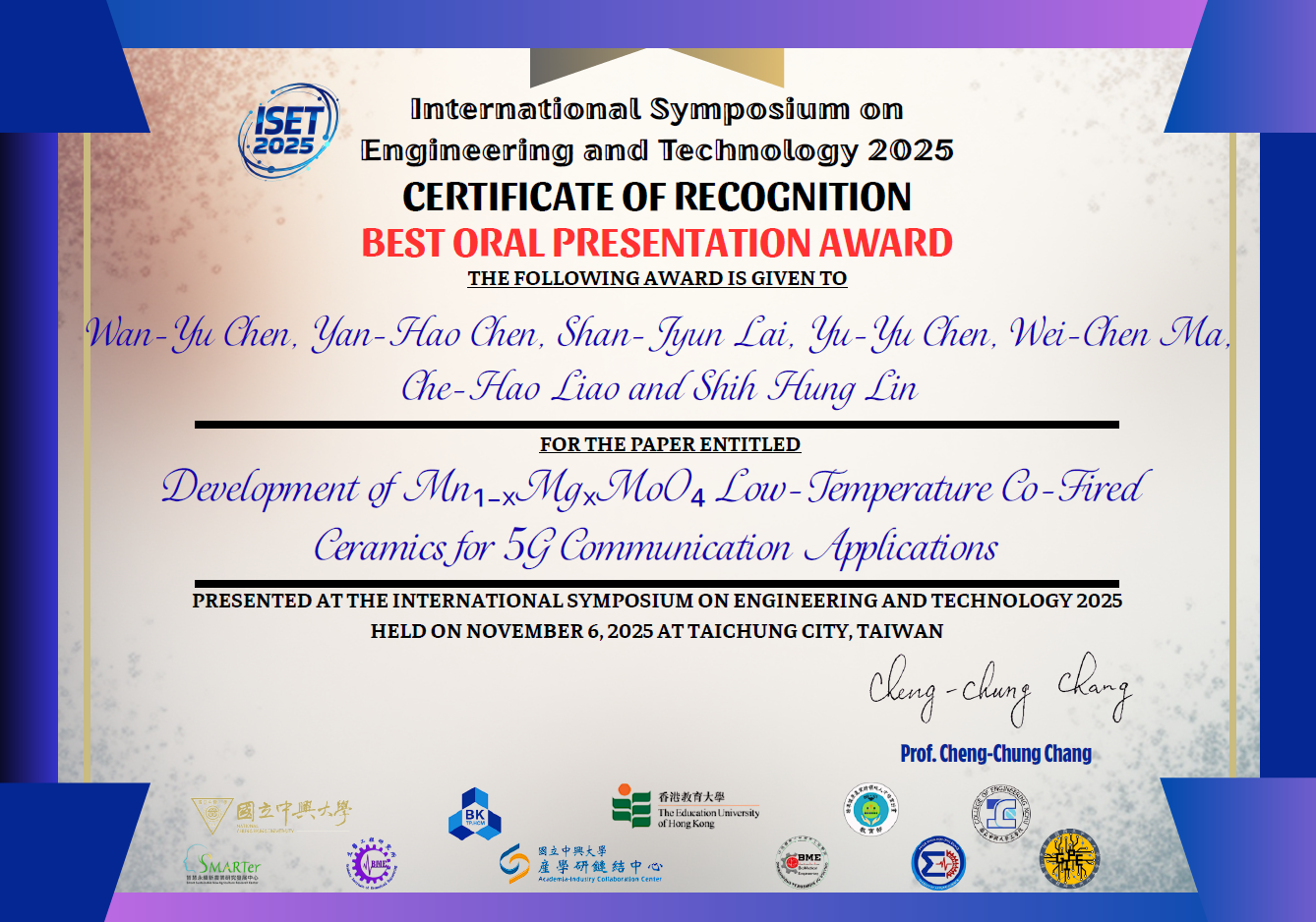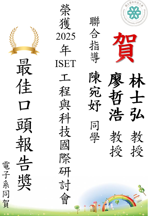陳宛妤同學 榮獲 2025年 ISET 工程與科技國際研討會 最佳口頭報告獎